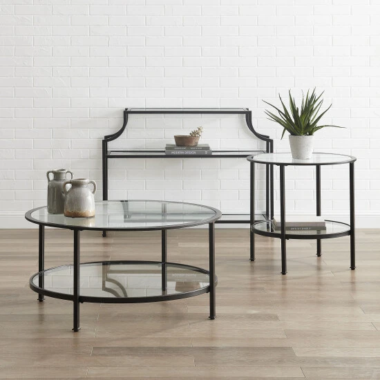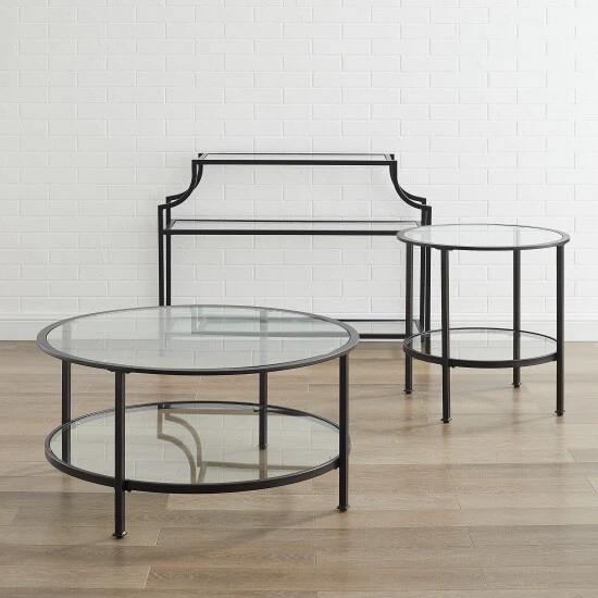 Bring a fashionable and cohesive look to any living space with the Aimee 3pc Occasional Table Set. With sleek steel frames and tempered glass on the tops and shelves, these tables can coordinate with a variety of décor without overwhelming the space. Featuring a round end table, coffee table, and pagoda-style console, this occasional set will complete your home’s style with a modern edge. – Art Deco inspired design – Oil-rubbed bronze finish – Frame is constructed of sturdy steel – Tempered glass tabletops – Tempered glass shelves – Pagoda-styled console table frame – Round coffee table and end table frames – Upscale display and storage for any room – Pairs well with industrial, rustic, modern farmhouse, and traditional decor