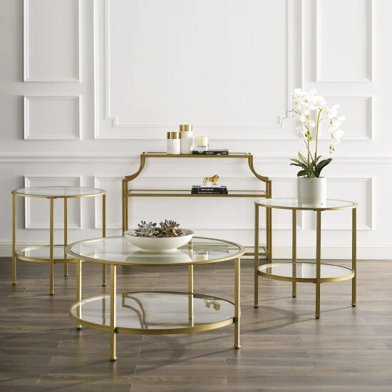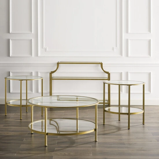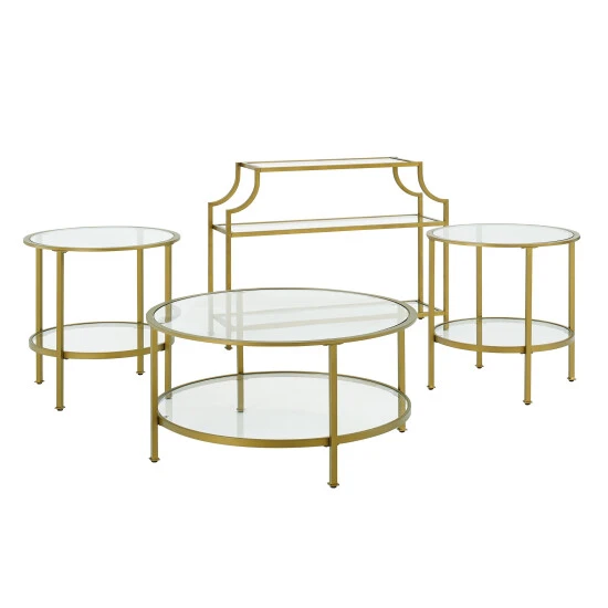 This four-piece set includes a console table, coffee table, and two side tables for a cohesive look. These airy designs are crafted from tempered glass shelves and steel frames in an antique gold powder-coated finish, while open shelves provide ample space to display photos, decor, books, and more.