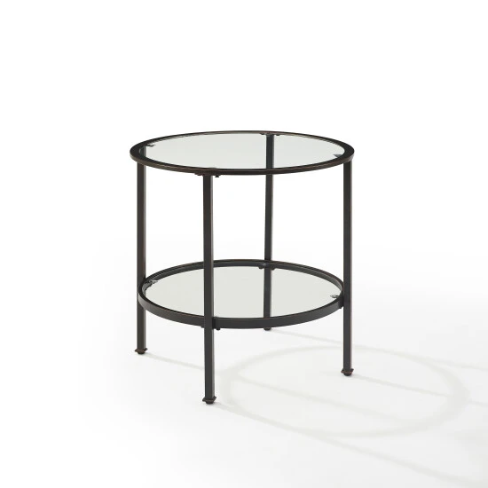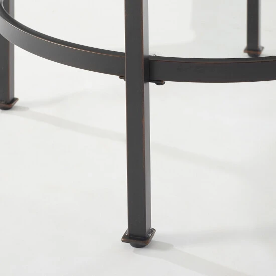 The Aimee End Table brings a stylish and modern edge to any home. With a sturdy yet sleek steel frame, this side table can be paired with a variety of decor without overwhelming the space. The Aimee End Table’s tempered glass top and shelf create an inviting surface just right for your favorite beverage or a good book. – Art Deco inspired design – Oil-rubbed bronze finish – Frame is constructed of sturdy steel – Tempered glass tabletop – Tempered glass shelf – Upscale display and storage for any room – Pairs well with industrial, rustic, modern farmhouse, and traditional decor