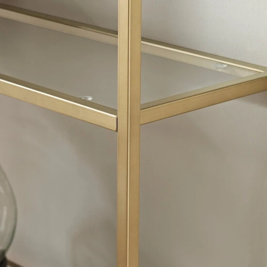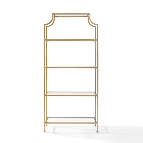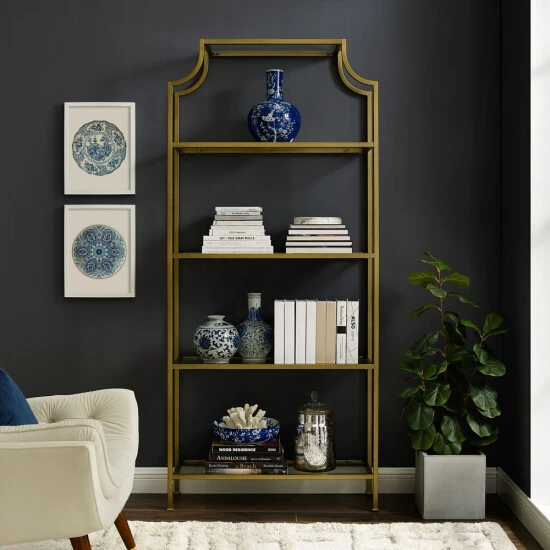 Lift up the modern aesthetics of your living room with this minimalist and straight-lined bookshelf boasting an understated yet chic metal and glass construction. This bookshelf’s pagoda-like styling and antiqued gold finish add a dash of visual drama to your space. Use the multiple open shelves of this bookcase to showcase your collection of classic reads or decor items.- Art Deco inspired design – Soft gold finish – Frame is constructed of sturdy steel – Four tempered glass shelves – Pagoda-styled frame – Upscale display and storage for any room – Modular design allows multiple units to be paired together – Pairs well with glam, traditional and modern farmhouse decor