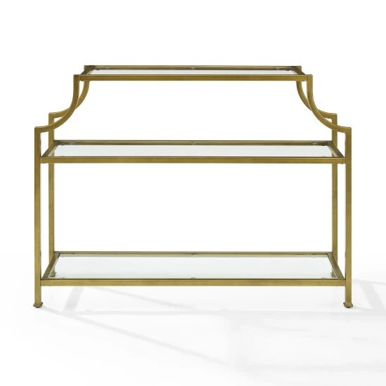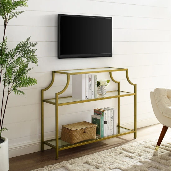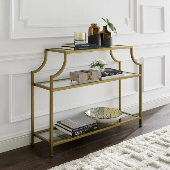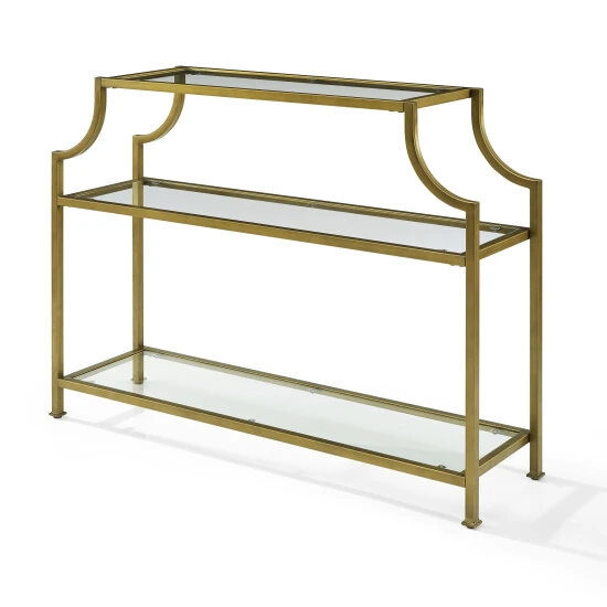 Crafted with mid-century charm, this striking console table will add the perfect touch of style to your space. The table features a powder-coated steel frame with an antiqued gold finish, the supports on the shorter top tier curving inward for an extra touch of retro charm. The durable, tempered glass tabletop and lower shelves provide plenty of space for your trinkets and decor.