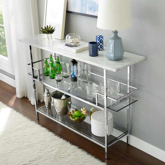 Serving up style alongside your favorite libations, this bar is sure to reinvigorate your space. The chrome finish has modern appeal, and the faux marble top is chic and alluring. Glass shelves make for a crisp and classic way to add some elegance and grandeur to your space that you will adore.