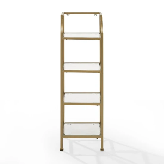 Stylish and modern, the Aimee Short Etagere is an eye-catching addition to a bathroom or home office. With a sturdy yet sleek steel frame, this etagere can store bath items like towels and toiletries or books and decor for a home office. The open tempered glass shelves of the etagere offer organization without overwhelming the room. – Art Deco inspired design – Soft gold finish – Frame is constructed of sturdy steel – Four tempered glass shelves – Upscale display and storage for any room – Pairs well with glam, modern farmhouse, and traditional decor