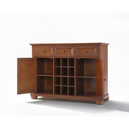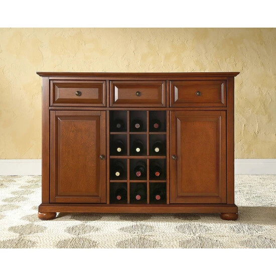Constructed of solid hardwood and wood veneers, this Buffet Server / Sideboard Cabinet is designed for longevity. The beautiful raised panel doors and drawers, provide the ultimate in style to dress up your home. The three deep drawers provide an abundance of storage space. Behind the two doors, you will find adjustable shelves and storage space for things that you prefer to be out of sight. The center storage area is great for up to 12 bottles of wine, or if you prefer, remove the wine storage cubes to reveal an adjustable shelf. Style, function, and quality make this Buffet Server a wise addition to your home.