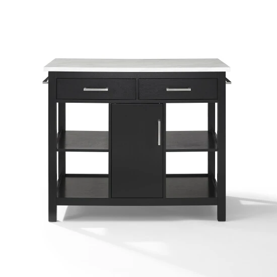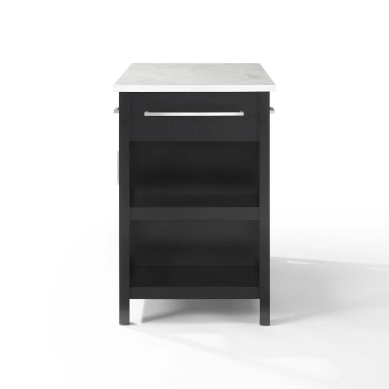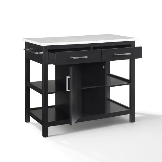 This versatile kitchen island provides access to dishes, utensils, and more from any side. The open shelves are easily accessible from any side, and the two drawers and single cabinet can also be opened from either side for accessibility. The sleek black base is complemented by a beautiful faux marble top or a sleek modern look.