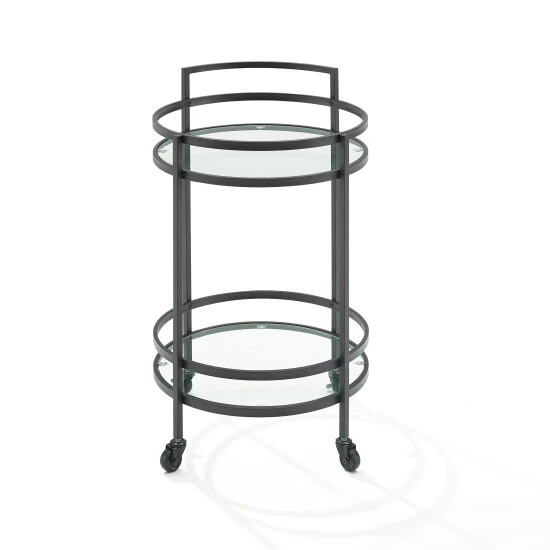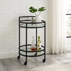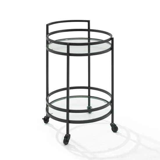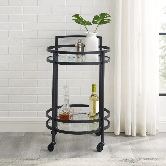 Featuring a modern silhouette and finish, the Bailey Round Bar Cart is ready to party in style. With a small footprint and caster wheels, this cart creates a mobile beverage station, plant stand, or end table. The two tempered glass shelves can support wine and liquor bottles, as well as glassware and decor. The Bailey Bar Cart is a lovely addition to any room in your home.Features: Art Deco inspired design, Frame is constructed of sturdy steel, Matte black finish, Two tempered glass shelves each with a 20lb weight limit, Includes a total of four caster wheels with two that lock, Pairs with glam, traditional, mid-century, and modern farmhouse decor