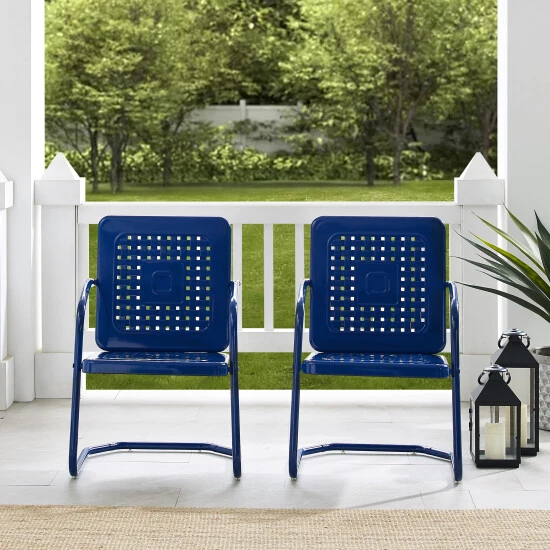 Nostalgia abounds with the Bates 2pc Chair Set. Two vintage-style chairs in a variety of vibrant colors offer a fun outdoor lounging experience. Each chair features a square back with a unique basket weave design that allows air to circulate, and a cantilever base for relaxing in comfort. Made of durable steel, the chairs have a powder-coated finish that resists rust and sun fade. The Bates chairs are sure to add a dash of retro fun to your porch or patio.Features: Retro design, Sturdy steel construction, Weather-resistant powder-coated finish, UV and rust resistant, Navy gloss finish, Back and seat have a basket weave design with holes for air circulation, Cantilever base provides flex for lounging, Ideal for small outdoor spaces, Seating for two