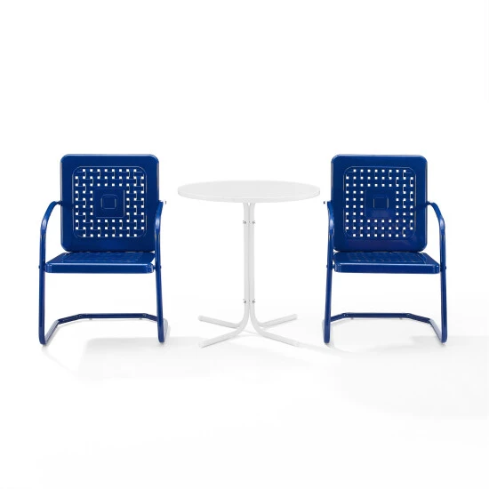 Nostalgia abounds with the Bates 3pc Bistro Set. Two vintage-style chairs in vibrant colors surround a simple metal bistro table for a fun and functional outdoor lounging experience. Each chair features a square back with a unique basket weave design that allows air to circulate. With a cantilever base, the chairs offer just enough flex for relaxing outdoors. The table’s sturdy pedestal base is comprised of four metal legs and easily tucks between the chairs, making the Bates 3pc Bistro Set ideal for a small balcony or patio.Features: Retro design, Sturdy steel construction, Weather-resistant powder-coated finish, UV and rust resistant, Back and seat have a basket weave design with holes for air circulation, Bistro table has pedestal base, Ideal for small spaces, Seating for two, Table weight limit is 100lbs, Chair Dimensions – 22″W x 35″H x 22″D, Bistro Table Dimensions – 28.88″ H x 27.88″W x 27.88″L, Table weight limit is 100lbs