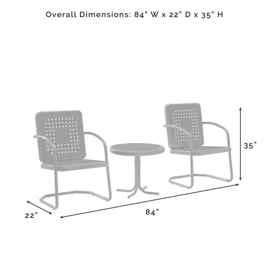 Nostalgia abounds with the Bates 3pc Chair Set. Two vintage-style chairs in vibrant colors surround a simple metal side table for a fun and functional outdoor lounging experience. Each chair features a square back with a unique basket weave design allowing air to circulate for added comfort. With a cantilever base, the chairs offer just enough flex for relaxing outdoors. The table’s sturdy pedestal base easily tucks between the chairs, making the Bates 3pc Chair Set ideal for smaller outdoor spaces.Features: Retro design, Sturdy steel construction, Weather-resistant powder-coated finish, UV and rust resistant, Back and seat have a basket weave design with holes for air circulation, Cantilever base on chairs provides flex for lounging, Pedestal table base, Ideal for small outdoor spaces, Seating for two, Table weight limit is 100lbs, Chair Dimensions – 22″W x 35″H x 22″D, Side Table Dimensions – 22″W x 19″H x 22″D