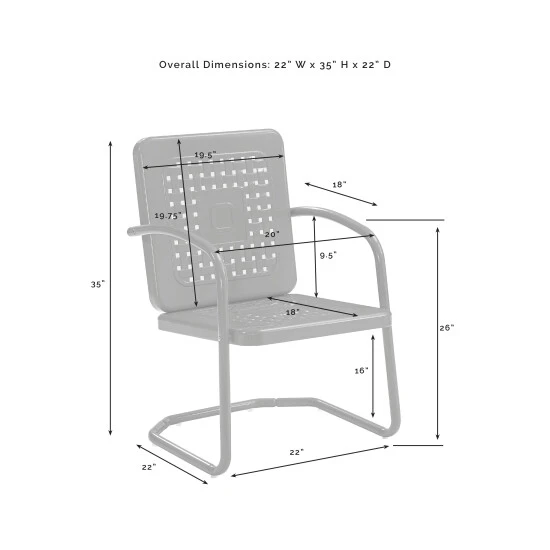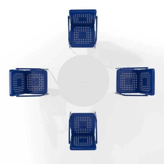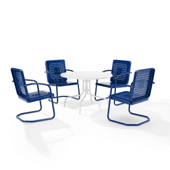 Nostalgia abounds with the Bates 5pc Dining Set. Four vintage-style chairs in vibrant colors surround a simple metal dining table for a fun and functional outdoor lounging experience. Each chair features a square back with a unique basket weave design that allows air to circulate. With a cantilever base, the chairs offer just enough flex for relaxing while dining al fresco.Features: Retro design, Sturdy steel construction, Weather-resistant powder-coated finish, UV and rust resistant, Back and seat have a basket weave design with holes for air circulation, Cantilever base on chairs provides flex for lounging, Standard umbrella hole in table measures 1.625″ in diameter, Seating for four, Table weight limit is 100lbs, Chair Dimensions – 22″W x 35″H x 22″D, Table Dimensions – 39″W x 25.625″H x 39″D