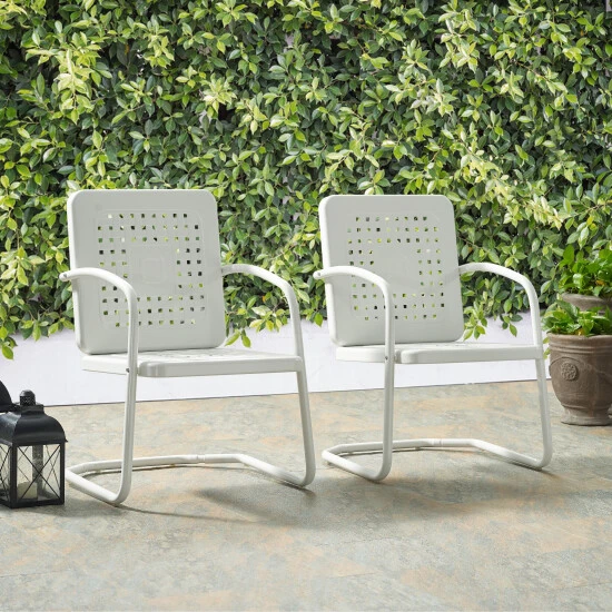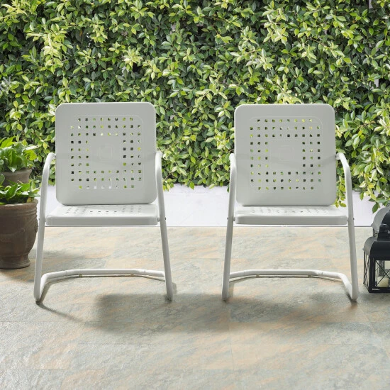 Chill out by the pool or on your patio in this pair of classic metal chairs. Vintage style meets modern construction in these sturdy, weather-resistant, powder-coated steel chairs. Perforation on the back panel and seat of the chair allows for cool ventilation while you’re sitting outside.