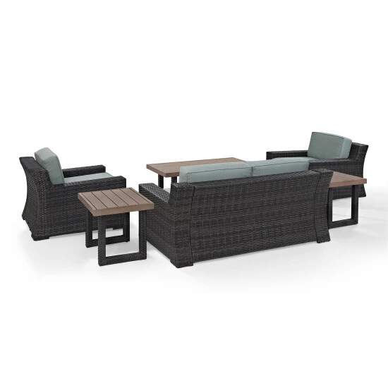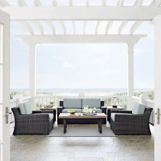 Bring the style and comfort of indoor furniture to your outdoor spaces with the Beaufort conversation set from Crosley Furniture. This well-made, sophisticated seating collection features low-profile club styling with crisp lines and understated curves, resulting in an attractive aesthetic. Our easy-to-maintain dark brown synthetic wicker is water and UV resistant, and the solution-dyed polyester, mist-colored cushions will resist fading. Seating surfaces are generous in size, and feature resilient foam cushion inserts. The modern side table is distinguished by its angular base, and top that features planks of all-weather faux wood with embossed grain details. With the Beaufort collection from Crosley Furniture, comfort lives outside.