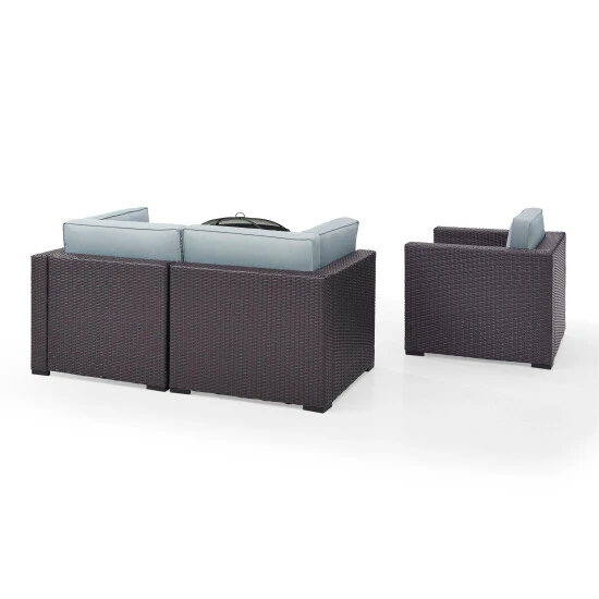 Entertaining outdoors is made effortless with the Biscayne 4-Piece Sectional. This set is stylish and durable thanks to the UV resistant resin wicker, woven over a tough steel frame. The high-grade cushion cores ensure that comfort isn’t sacrificed, while their moisture resistant covers guarantee year-round protection. This set includes two corner chairs, an armchair, and a firepit. Easy to assemble and easy to enjoy.