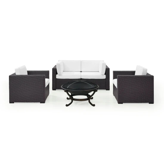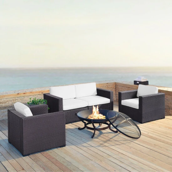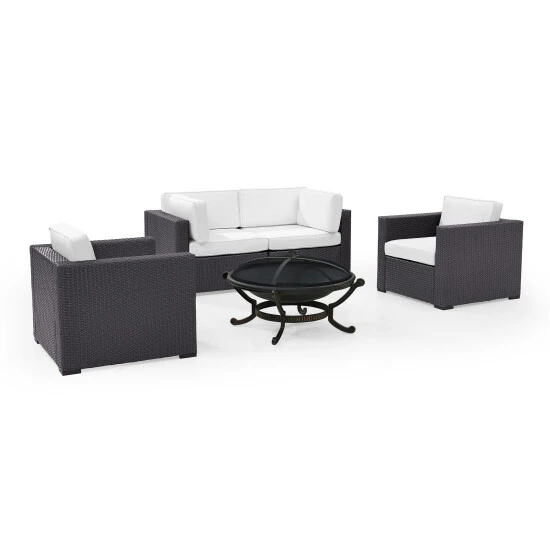 Entertaining outdoors is made effortless with the Biscayne 5-Piece Sectional. This set is stylish and durable thanks to the UV resistant resin wicker, woven over a tough steel frame. The high-grade cushion cores ensure that comfort isn’t sacrificed, while their moisture resistant covers guarantee year-round protection. This set includes two armchairs, two corner chairs, and a firepit. Easy to assemble and easy to enjoy.