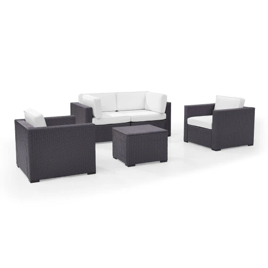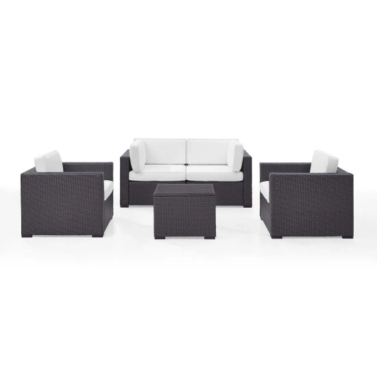 Arrange this versatile seating set on your porch or patio for a comfortable conversation area or carefree outdoor party. Featuring woven wicker construction over a sturdy steel frame, this five-piece set is made with UV- and moisture-resistant materials for lasting beauty.