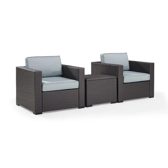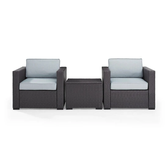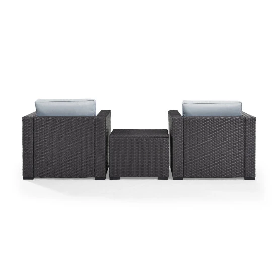 Create a beautiful outdoor seating nook for two with this Biscayne three-piece outdoor seating set. The set is made with durable steel frames, weather-resistant cushions, and high-quality wicker for impressive longevity.
