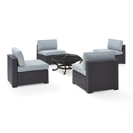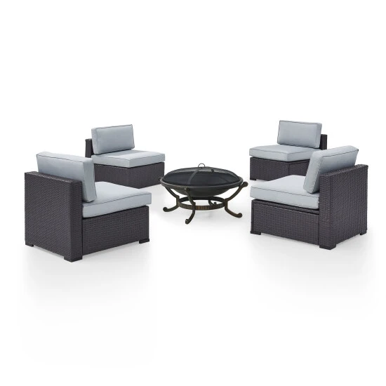 Gather for an enjoyable evening with this set, which includes four chairs and a firepit to create a relaxing outdoor oasis. Moisture-resistant cushions dry quickly for everyday use.