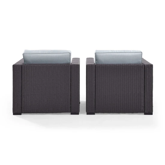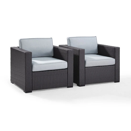 Seat family and friends comfortably in this set of two brown outdoor chairs with cozy blue-grey cushions. The UV-resistant wicker construction withstands moisture to keep these steel-framed chairs looking great for years to come.