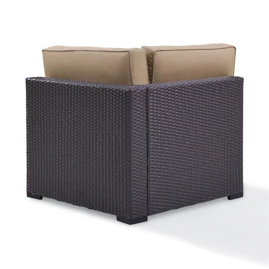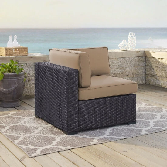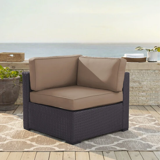 Place this corner chair in a nook on your patio, and curl up with a book in the soft cushions. The UV-resistant wicker over a steel frame paired with moisture-resistant cushions ensures this chair weathers the elements for long-lasting use.