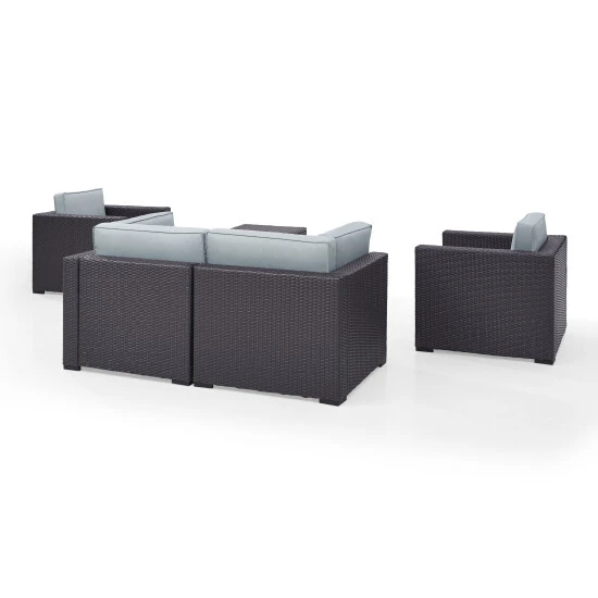 Relish the refreshing breeze and stunning view outdoors when you relax on this five-piece seating set. The coffee table, two armchairs, and two corner chairs are made from UV-resistant resin wicker with a steel frame to withstand the elements.