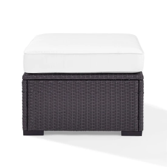 Enjoy comfort outside the house when resting on this Biscayne ottoman topped with a plush and versatile white cushion. Due to a robust steel frame and UV-resistant resin wicker, this ottoman offers extended longevity.