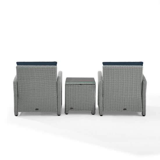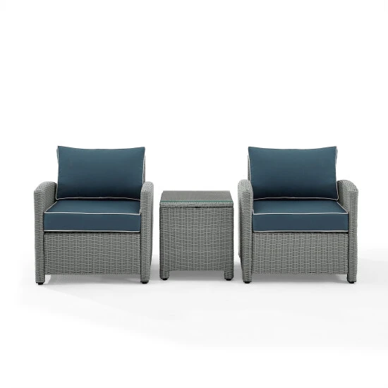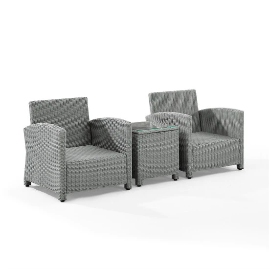 Create a relaxing retreat on your front porch or patio with the Bradenton 3pc Armchair Set. Perfect for kicking back on a sunny day, the armchairs and side table have sturdy steel frames wrapped in all-weather wicker. Featuring gently arched arms and moisture-resistant cushions, each chair is made for comfort and style. The tempered glass top of the side table is a great place to rest a cool drink, making the Bradenton 3pc Armchair Set a wonderful addition to any outdoor space.Features: Traditional design, UV resistant all-weather half-round resin wicker, Weather-resistant powder-coated steel frame, Handwoven resin wicker, High-performance solution-dyed polyester cushion covers resist mildew, sun fade, and abrasion, Moisture-resistant high grade cushion cores, Removable cushion covers are machine washable, Adjustable levelers on legs, Tempered glass tabletop, 5″ thick seat cushion and 4″ thick back cushion, Seating for two, Table weight limit is 100lbs, Armchair Dimensions – 32.5″H x 30.5″W x 31.75″D, Side Table Dimensions – 21.25″H x 20″W x 20″D