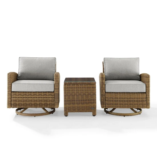 Outdoor relaxation has never looked better than with the Bradenton 3pc Chair Set. The sturdy steel frames are wrapped in beautiful all-weather wicker while the chairs offer a high-quality rocking and swivel base for smooth, easy motion. With gently arched arms and moisture-resistant cushions, the swivel rockers are made for comfort. Add the glass top-side table and the Bradenton 3pc Swivel Rocker Chair Set makes outdoor entertaining a breeze.Features:Traditional designUV resistant all-weather half-round resin wicker with rattan lookWeather-resistant powder-coated steel frameHandwoven weathered brown resin wickerGray cushion coversHigh-performance solution-dyed polyester cushion covers resist mildew, sun fade, and abrasionMoisture-resistant high grade cushion coresRemovable cushion covers are machine washable360-degree swivel chair base with rocking motion5″ thick seat cushion and 4″ thick back cushionHigh-performance Sunbrella solution-dyed acrylic cushion coversColorfast Sunbrella fabric is easy to clean, and resists stains, mildew, and abrasionMoisture-resistant high grade cushion coresRemovable cushion covers are machine washable360-degree swivel chair base with rocking motion5″ thick seat cushion and 4″ thick back cushionSide table has a tempered glass top with a weight limit of 25lbsSwivel Rocker Dimensions: 30.25″W x 31″D x 35.5″H / 48.8lbsSide Table Dimensions – 20″W x 20″D x 21.25″H / 24.2lbs