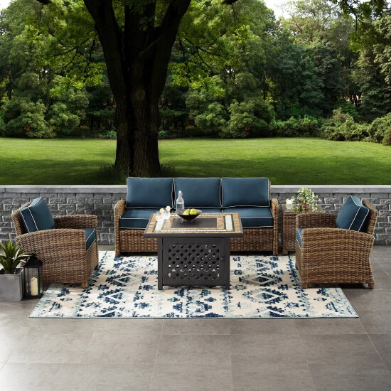 Host outdoor gatherings when you furnish your patio or deck with this five-piece set of wicker furniture including a sofa, two armchairs, a side table, and a firepit. Thick navy cushions covered in UV-resistant fabric provide comfort, and a firepit makes a delightful centerpiece for the seating group. With a strong steel base and tiled top for added beauty, the firepit features an ingenuous design with a sliding base that allows you to easily access the propane tank and lattice doors that conceal the controls.