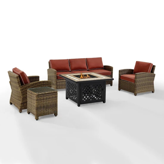 Spend warm summer days and cool summer nights in luxury with the 5-Piece Bradenton Sectional Fire Pit Set from Crosley. All-weather wicker and three choices of UV-resistant fabric cushions combine elegant lines with casual comfort in one versatile design with dozens of possibilities. Fire pit is constructed from a sturdy powder-coated steel frame and beautifully tiled stone top, this rugged firepit is the centerpiece for this set. The fire pit’s simple controls are hidden inside the lattice frame doors, and a sliding base provides easy access to your propane tank.