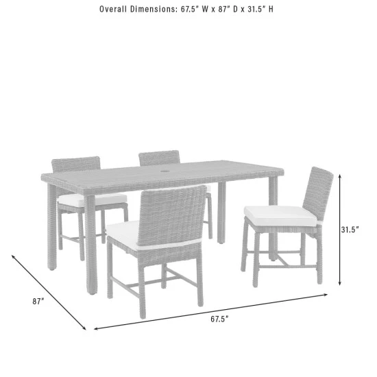 Host a dinner party under the stars with the Bradenton 5pc Outdoor Dining Set. The four dining chairs and large rectangular table feature steel frames wrapped in all-weather wicker, while the table showcases a durable top. Offering seating for four diners, this dining set has a standard umbrella hole at the center keeping your guests shaded and comfortable. Add the Bradenton dining set to any outdoor space for stylish al fresco dining.Features:Traditional designUV resistant all-weather half-round resin wickerWeather-resistant powder-coated steel frameHandwoven weathered brown resin wickerNavy cushion covers with contrast white pipingNeutral sand cushion covers with white pipingHigh-performance solution-dyed polyester cushion covers resist mildew, sun fade, and abrasionMoisture-resistant high grade cushion coresRemovable cushion covers are machine washableThe cushions are secured with sturdy Velcro tabs for easy removalBrown slatted tabletopStandard umbrella hole in table measures 1.67″ in diameterUmbrella hole cover sits flush with the tabletopAdjustable levelers on legsSeating for fourTable weight limit is 100lbsChair Dimensions: 17.75″W x 19.75″D x 31.5″H / 12.65lbsTable Dimensions: 67.5″W x 33.75″D x 30″H / 59.18lbs