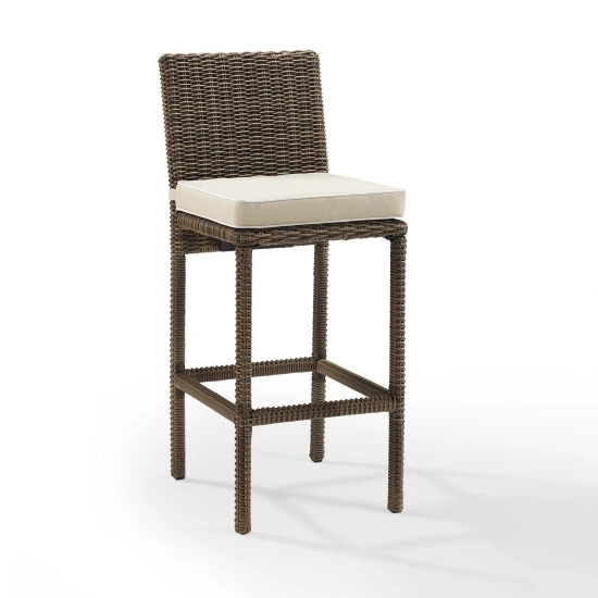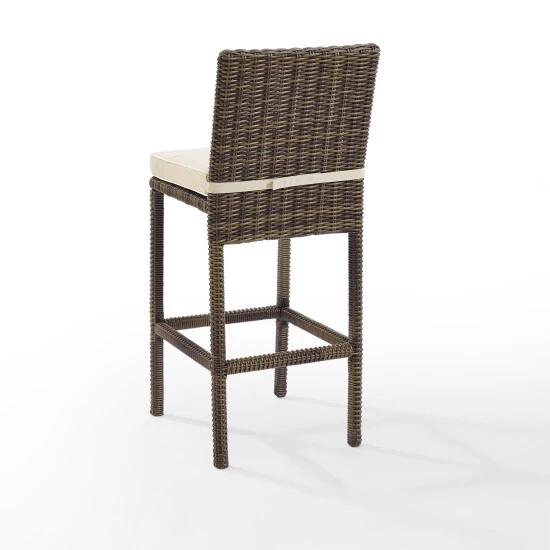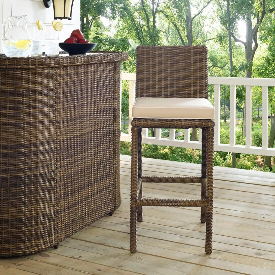 Accommodate your guests at an outdoor counter or bar with this set of two Bradenton wicker stools. The sand colored cushions are both water and UV-resistant to keep them looking great in all weather.