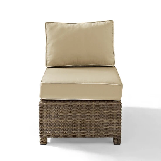 The center chair from the Bradenton Outdoor Sectional Sofa collection is constructed from durable steel with all-weather wicker. The seat is complete with UV-resistant polyester fabric in a sand color.