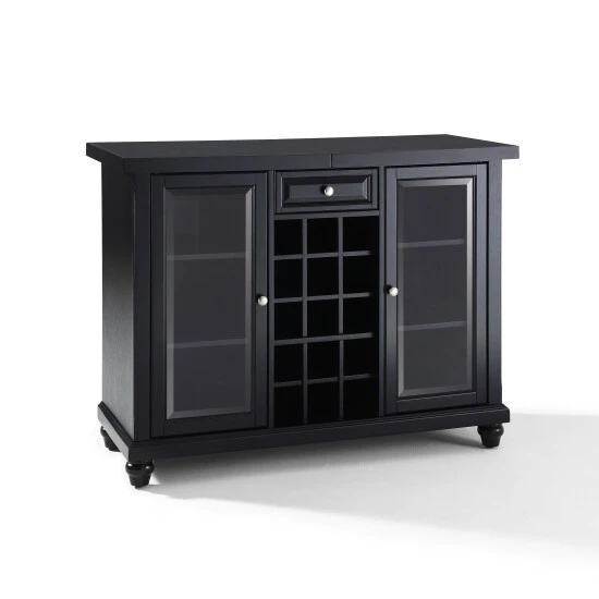 Elegantly entertain guests with this sliding top bar cabinet constructed of solid hardwood and wood veneers. The beautiful beveled/tempered glass doors and raised panel drawer front are classically styled to enhance any home decor. The sliding top expands to greatly increase the size of your serving area. Behind the two doors, you will find adjustable shelves and plentiful storage space for spirits, appliances and other items that require additional space. The center storage area is great for up to 15 bottles of wine, or if you prefer, remove the wine storage cubes to reveal an adjustable shelf. Style, function, and quality make this sliding top bar cabinet a wise addition to your home.