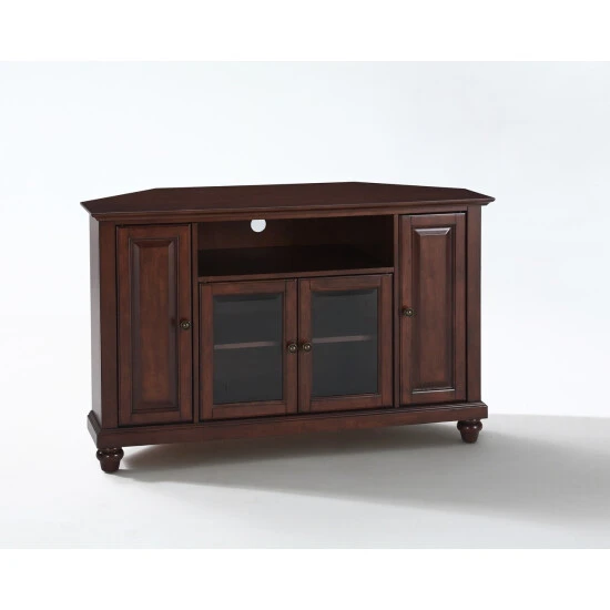 Remodel your family room with this corner TV stand. Made from wood, this table features shelves that adjust to fit your items, and the mahogany finish and antique brass hardware provide an upscale look.