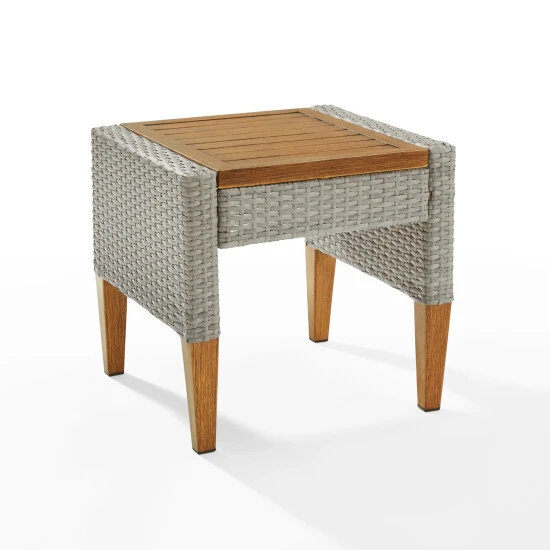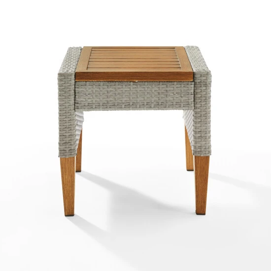 A stylish mix of elements comes together to create the Capella Side Table. Featuring all-weather resin wicker and a hand-painted slatted steel top that looks like real wood, this side table is a durable outdoor essential. The Capella side table blends cool neutral tones and a natural finish to add a coastal vibe to your outdoor space.Features:Modern coastal designUV resistant all-weather reed style flat resin wickerWeather-resistant powder-coated steel frameHandwoven gray resin wickerSteel tapered legs and tabletop are hand-painted, offering a natural teak look with better durability than traditional wood furnitureClassic slatted tabletopTable weight limit is 100lbs