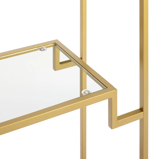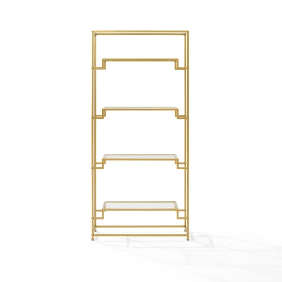 Sophisticated and stunning, the Celeste Etagere elevates everyday home organization. Made from sturdy steel, this beautiful bookcase features a sculptural frame built for displaying books, keepsakes, and décor. The clear tempered glass shelves give the Celeste Etagere a sleek silhouette that doesn’t overpower the room.Features:Art Deco inspired designFrame is constructed of sturdy steelGold finishFour tempered glass shelves each with a 20lb weight limitAdjustable levelers on legsModular design allows multiple units to be paired togetherPairs well with glam and modern decor