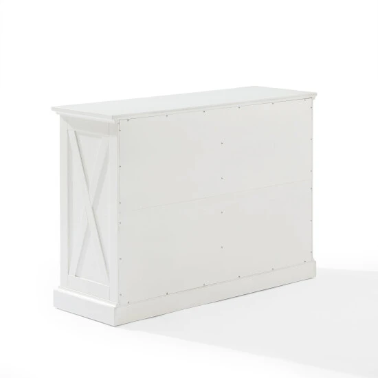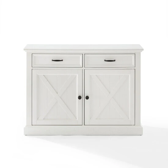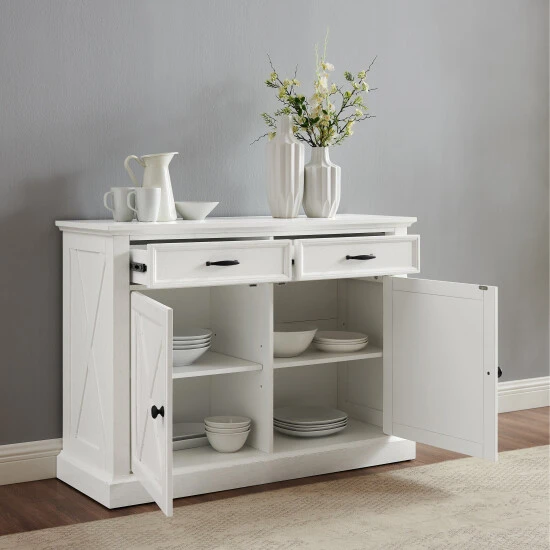 Delivering modern farmhouse charm to your home, the Clifton Sideboard features a classic x motif reminiscent of a barn door. The sideboard’s two full-extension drawers and two large cabinets with adjustable shelving offer ample storage for any room. Use the Clifton Sideboard as a dining room buffet, credenza or media stand. This sideboard is full of stylish possibilities.Features:Modern farmhouse designDistressed white finishGenuine metal hardware in a gunmetal finishRustic x-pattern on cabinet doors and sidesCabinet doors have magnetic closuresTwo adjustable and removable shelves, each with a 15lb weight limitTwo full-extension drawers on ball-bearing glides, each with a 15lb weight limitPairs well with traditional decorSideboard top weight limit is 100lbs