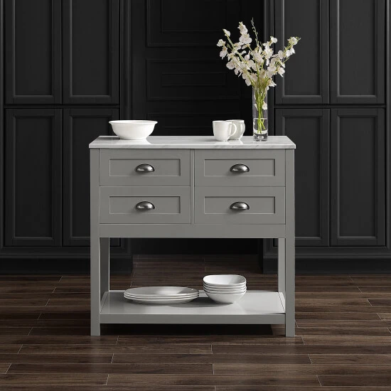 Elevate any kitchen with the high-end look of the Connell Kitchen Island/Cart. Ideal for adding counter space and extra storage, this kitchen island features four sizeable drawers perfect for utensils, flatware, and linens. An open stationary shelf can store larger items or be used for display. With optional casters and a beautiful faux marble countertop, the Connell Kitchen Island/Cart makes for a stylish coffee bar or mobile island.Features:Modern farmhouse designClassic cup pull hardware in a brushed nickel finishFour full-extension storage drawers on ball-bearing glides, each with a 15lb weight limitOpen stationary shelf with a 20lb weight limitIncludes four optional caster wheels with two that lockFinished backPairs well with traditional and coastal decorCountertop weight limit is 100lbs