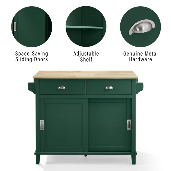Expand your kitchen workspace and storage area with the Cora Drop Leaf Kitchen Island. Featuring two large cabinets with adjustable shelving, this island uses sliding cabinet doors to maximize space. Two storage drawers corral utensils and dishtowels, while the drop leaf countertop can be raised for added dining space. Pull up your two favorite counter stools and the Cora Kitchen Island becomes your home’s favorite hangout.Features:Traditional designWood countertop with a natural finishWhite finishNavy finishEmerald green finishGenuine metal hardware in a brushed nickel finishLarge lower cabinet with dual sliding doorsAdjustable and removable shelf inside cabinet with a 15lb weight limitTwo large storage drawers with metal roller glides, each with a 15lb weight limitDrop leaf counter extension creates extra counter space for dining or food prepDrop leaf expands the countertop from 18.13″ to 27.25″Two easily accessible wood towel barsFinished backPairs well with modern and farmhouse decorCountertop weight limit is 100lbs