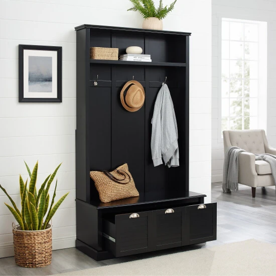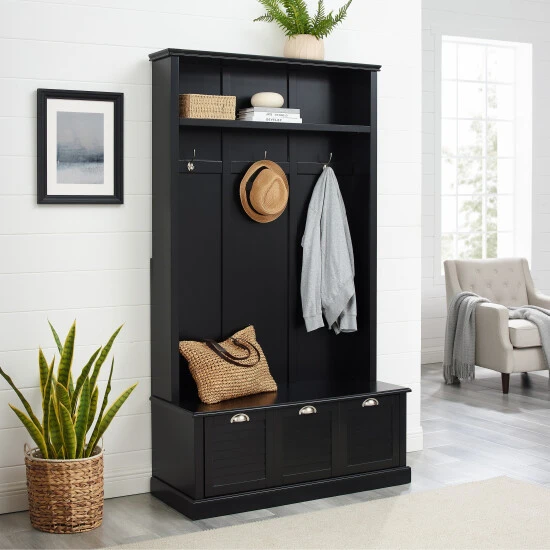Keep your home’s entryway tidy and organized with the classic Ellison Hall Tree. Featuring louvered accents on the bottom drawer and raised paneling on the back, this hall tree makes home organization look good. Hang your coat and hat on one of the three double-pronged hooks, then take a seat on the bench to remove your shoes at the end of the day. Once off, you can tuck your shoes in the pull-out storage drawer in the base and use the display shelf at the top for smaller items like keys and sunglasses. Whether you’re coming or going, the Ellison Hall Tree will keep all your everyday items close at hand.Features:Coastal designGenuine metal hardware in a brushed nickel finishClassic half-cup pull hardwareOpen stationary shelf with a 20lb weight limitThree double prong hooks each with a 5lb weight limitLarge storage drawer in base with ball-bearing glides and a 20lb weight limitSupport bar on back prevents bending or misalignmentPairs well with traditional and modern farmhouse décor