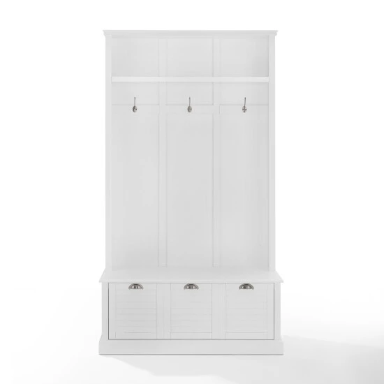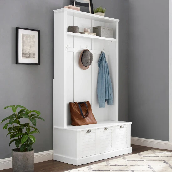 Keep your home’s entryway tidy and organized with the classic Ellison Hall Tree. Featuring louvered accents on the bottom drawer and raised paneling on the back, this hall tree makes home organization look good. Hang your coat and hat on one of the three double-pronged hooks, then take a seat on the bench to remove your shoes at the end of the day. Once off, you can tuck your shoes in the pull-out storage drawer in the base and use the display shelf at the top for smaller items like keys and sunglasses. Whether you’re coming or going, the Ellison Hall Tree will keep all your everyday items close at hand. – Transitional design – White finish – Genuine metal hardware in a brushed nickel finish – Classic half-cup pull hardware – Three double prong hooks – Large storage drawer in base – Support bar on back prevents bending or misalignment – The small display shelf at the top has a 25-pound weight limit – Pairs well with traditional, cottage and modern farmhouse decor