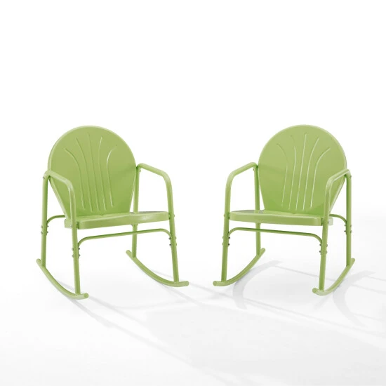 Rock away in the retro-inspired Griffith 2pc Rocking Chair Set. Made from sturdy powder-coated steel, these chairs have a durable design available in a variety of stylish colors. Low slanted seats allow you to recline on smooth metal rockers, while curved armrests maximize comfort for outdoor relaxation. The Griffith chairs make a perfect addition to your porch or balcony.Features:Retro designSturdy steel constructionWeather-resistant powder-coated finishKey lime gloss finishUV and rust resistantRound back with decorative groovesInclined seat is 18″ at its highest point and 14.5″ at its lowestIdeal for small outdoor spaces