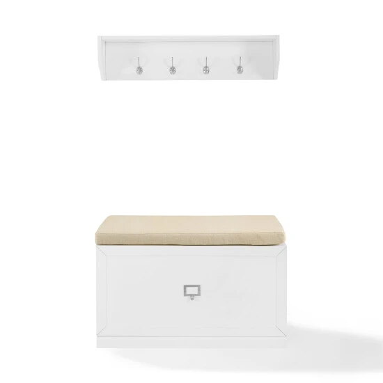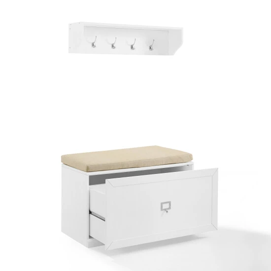 Even the smallest entryway needs a landing zone for jackets, shoes and book bags. Look no further than the Harper 2pc Entryway Set. This set combines an open shelf with four double hooks and an entryway bench with a large storage drawer. The open shelf is ideal for decor or small storage baskets, while the entryway bench offers a cushioned seat just right for sitting down to slip off your shoes at the end of the day. Featuring label holder hardware, the storage drawer can be customized with personal labels. The Harper 2pc Entryway Set can pair modularly with other items in the collection and create the look of genuine built-in storage. – Modern design – White finish – Genuine metal label holder hardware in a polished nickel finish fits labels up to 2″ x 1.25″, labels not included – Entryway bench has a large storage drawer on metal ball-bearing glides – Tan linen seat cushion included with bench – Storage shelf has four large double hooks – All pieces are modular to maximize space and flexibility – Pairs well with traditional, farmhouse, and transitional decor