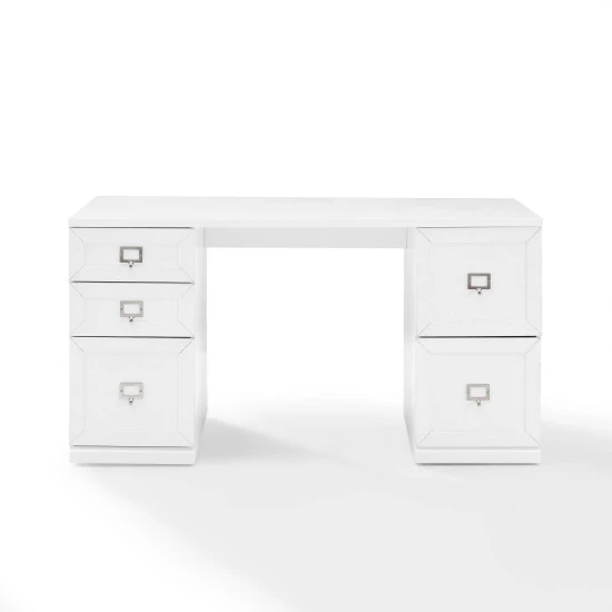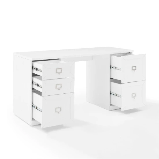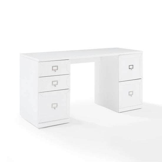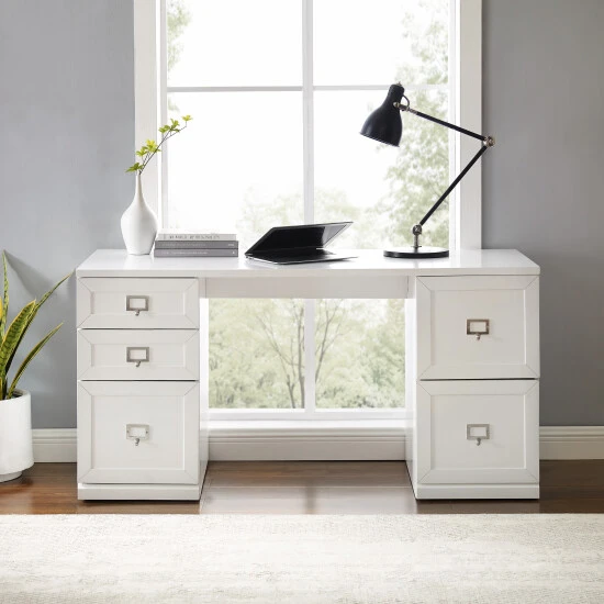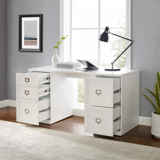 Maximize your productivity and organization with the Harper Desk. Featuring two small drawers and three file cabinet drawers, this desk is a telecommuter’s dream. Important documents can be filed away, maintaining a tidy workspace free of clutter. The spacious desktop has plenty of room for a laptop and other office supplies. With its sleek, modular design, the Harper desk offers versatility for expanding your home office and creating a space tailored to your needs.Features: Modern design, White finish, Genuine metal label holder hardware in a polished nickel finish fits labels up to 2″ x 1.25″, labels not included, Three file cabinet drawers with rails for hanging files, each with a 15lb weight limit, Hanging file rails can be adjusted to accommodate letter, A4, or legal size paper, Two full-extension drawers on ball-bearing glides, each with a 15lb weight limit, Adjustable levelers on legs, Modular design allows multiple units to be paired together, Pairs well with traditional, farmhouse, and transitional decor, Desktop weight limit is 100lbs