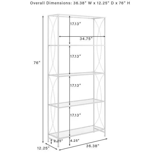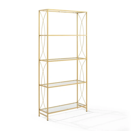 With a delicate design and sturdy build, the Helena Etagere balances form and function perfectly. The sturdy steel frame of the bookcase features beautiful curved accents, while the clear tempered glass shelves provide ample storage space. Create an elegant display in any room with the Helena Etagere.Features:Traditional designFrame is constructed of sturdy steelGold finishDelicate curved accentsFive tempered glass shelves each with a 20lb weight limitAdjustable levelers on legsModular design allows multiple units to be paired togetherPairs well with glam and modern farmhouse decor