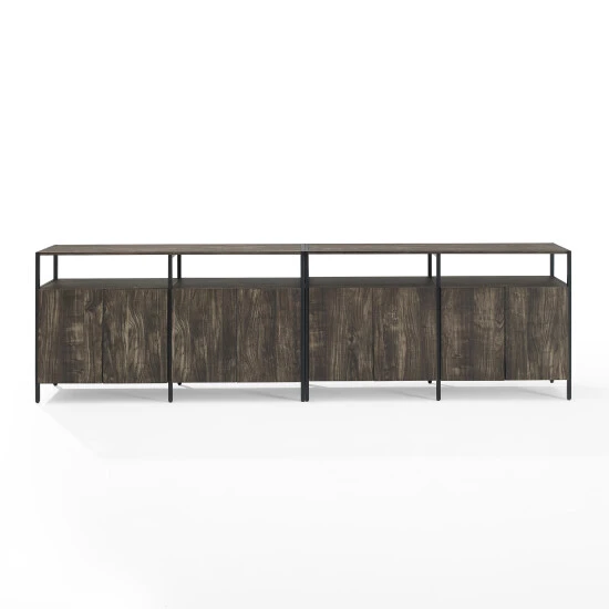 Bring a modern edge to home entertainment with the Jacobsen 108″ 2pc Media Stand. Combining sturdy steel with the look of rich wood, this set has a streamlined industrial look. Sure to be the focal point of your living room or home theater, this extra-large media stand can store and display a variety of technology, including a large television, turntables, and gaming systems. Beneath each tabletop is an open shelf plus two large cabinets ideal for housing your favorite vinyl, books, or board games. The Jacobsen media stand will be a perfect addition to your great room or man cave.Features: Industrial design, Brown ash finish with matte black steel, Square sturdy steel legs, Adjustable levelers on legs, Two cabinets with adjustable shelving and magnetic closures in each stand, The top of each stand is sized to fit most standard record players, Fits beneath wall-mounted TV’s up to 85″, Modular design allows multiple units to be paired together, Pairs well with rustic and farmhouse decor, Each shelf has a weight limit of 20lbs