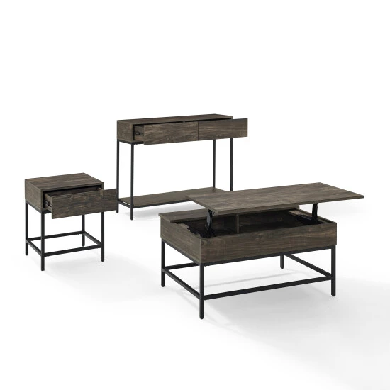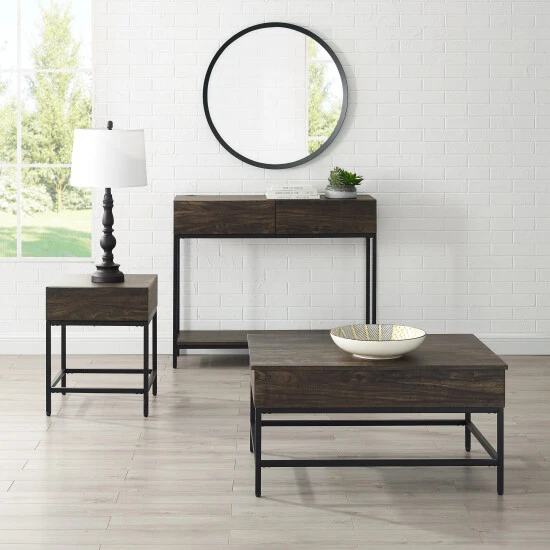 The modern family room is a multifunctional space in need of storage, tablespace, and a place to entertain, that’s where the Jacobsen 3pc Coffee Table Set comes in. Featuring an end table, a coffee table and console table, this set offers a stylish industrial aesthetic by combining the look of rustic wood with steel. The end table and console table feature full-extension storage drawers with sleek flat drawer fronts. The coffee table offers a unique storage option with its lift-top design that opens to storage within the table. Once raised, the lift-up top can become a dining or work space, offering much needed flexibility for the bustling households of today. – Industrial design – Brown ash finish with matte black steel – Console table has two full-extension storage drawers – End tables each have a full-extension drawer – Coffee table features a lift mechanism for a raised table space – Coffee table has storage space within the table, beneath the lift-top – Lift-top table has a weight limit of 100lbs – Modular design allows multiple units to be paired together – Pairs well with modern, farmhouse, and rustic decor – Coffee Table Dimensions – 36″W x 26″D x 18″H – End Table Dimensions – 18″W x 18″D x 22.5″H – Console Table Dimensions – 42″W x 14″D x 34.5″H