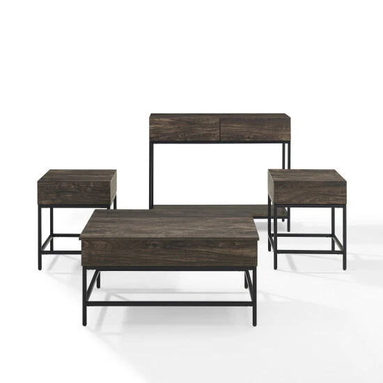 The modern family room is a multifunctional space in need of storage, tablespace, and a place to entertain, that’s where the Jacobsen 4pc Coffee Table Set comes in. Featuring two end tables, a coffee table and console table, this set offers a stylish industrial aesthetic by combining the look of rustic wood with steel. The end tables and console table all feature full-extension storage drawers with sleek flat drawer fronts. The coffee table offers a unique storage option with its lift-top design that opens to storage within the table. Once raised, the lift-up top can become a dining or work space, offering much needed flexibility for the bustling households of today. – Industrial design – Brown ash finish with matte black steel – Console table has two full-extension storage drawers – End tables each have a full-extension drawer – Coffee table features a lift mechanism for a raised table space – Coffee table has storage space within the table, beneath the lift-top – Lift-top table has a weight limit of 100lbs – Modular design allows multiple units to be paired together – Pairs well with modern, farmhouse, and rustic decor – Coffee Table Dimensions – 36″W x 26″D x 18″H – End Table Dimensions – 18″W x 18″D x 22.5″H – Console Table Dimensions – 42″W x 14″D x 34.5″H