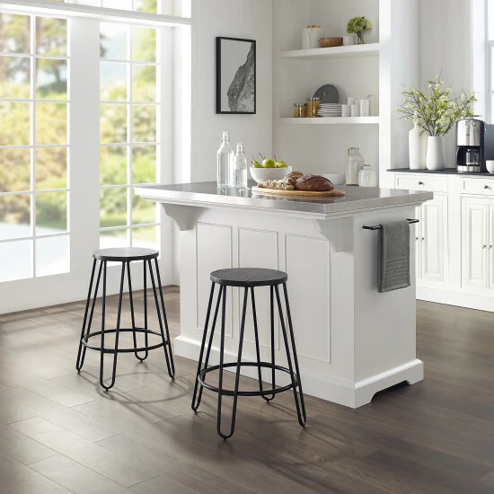 The Julia 3pc Kitchen Island Set offers space for food prep, entertaining, and dining all in one high-end package. The spacious countertop extends past the island base to accommodate two Ava Counter Stools. With on-trend hairpin legs, the Ava Stools add a unique flair to the set. The kitchen island features five storage drawers and two spacious cabinets, making kitchen organization a breeze. Additional details like a built-in spice rack and towel bar are icing on the cake for the classic multi-functional design of the Julia 3pc Kitchen Island Set.