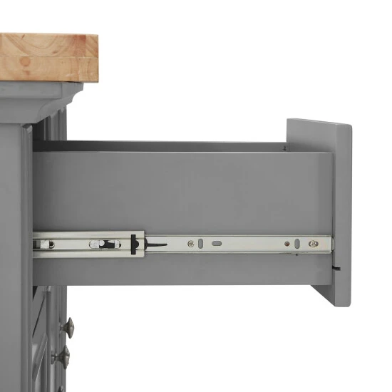 The Julia Kitchen Island offers space for food prep, entertaining, and dining in a stunning, multi-functional package. The large countertop extends past the island base to create extra space for meal prep or dining. An essential for kitchen organization, the island offers five drawers and two spacious cabinets for storage. Additional details like a built-in spice rack and towel bar are icing on the cake for the high-end design of the Julia Kitchen Island. – Transitional design – Genuine metal hardware in a brushed nickel finish – Five storage drawers on full-extension ball-bearing glides – Natural wood countertop – Two spacious storage cabinets – Built-in spice rack – Includes towel bar in a brushed nickel finish – Finished back with decorative trim – Large countertop extends 10″ past the base adding space for seating – Pairs well with traditional and farmhouse decor